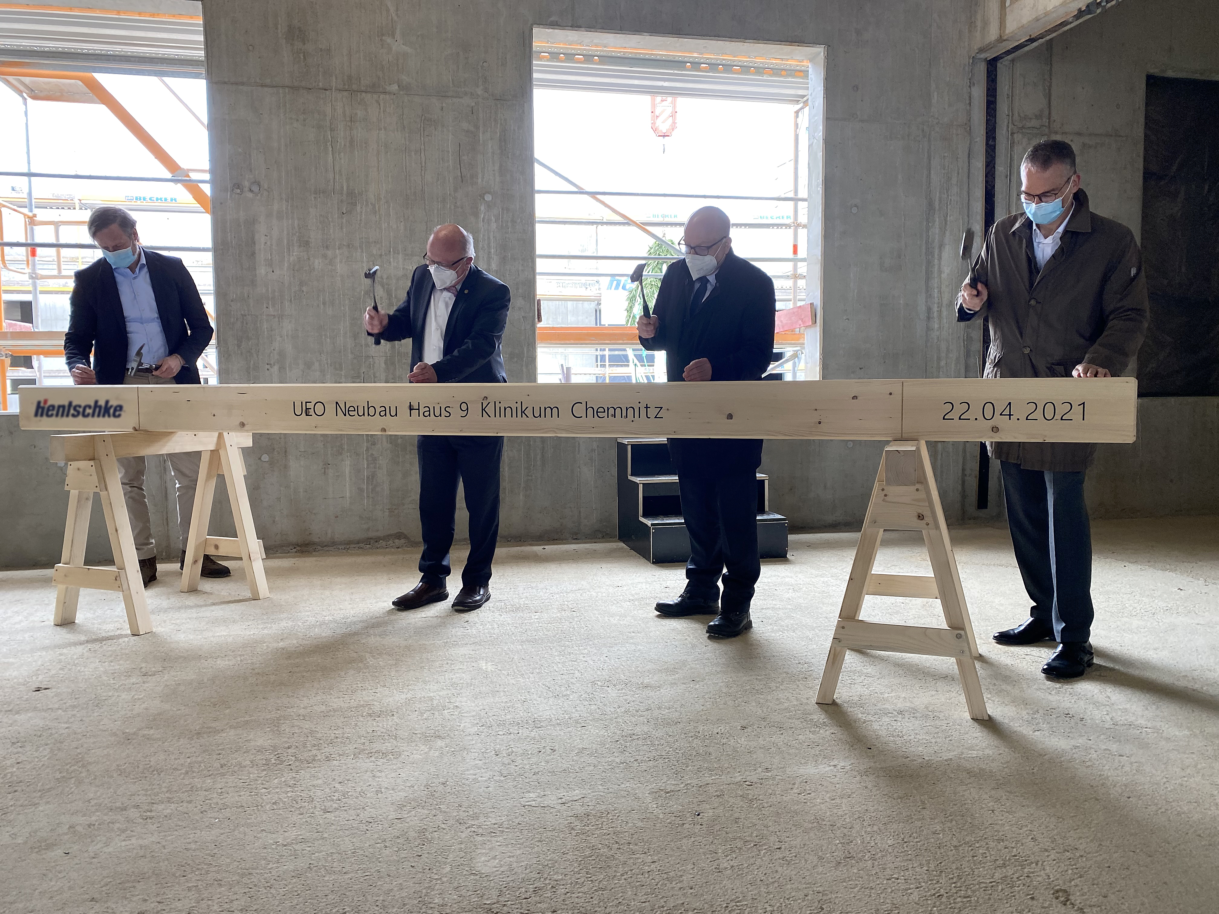 Chemnitz – Mit einem kräftigen Hammerschlag trieben der Oberbürgermeister und Aufsichtsratsvorsitzende des Klinikums Chemnitz, Sven Schulze, Michael Bockting, Abteilungsleiter Sozialversicherung und Krankenhauswesen aus dem Sächsischen Staatsministerium für Soziales und Gesellschaftlichen Zusammenhalt, sowie die Geschäftsführer des Klinikums, Dirk Balster und Dr. Thomas Jendges, heute jeweils einen Nagel in einen Holzbalken und symbolisierten damit beim Richtfest den Abschluss des Rohbaus inklusive Dach für den Neubau Haus 9. Das wichtige Strukturprojekt ist das größte Einzelbauvorhaben des Klinikums seit Jahrzehnten.