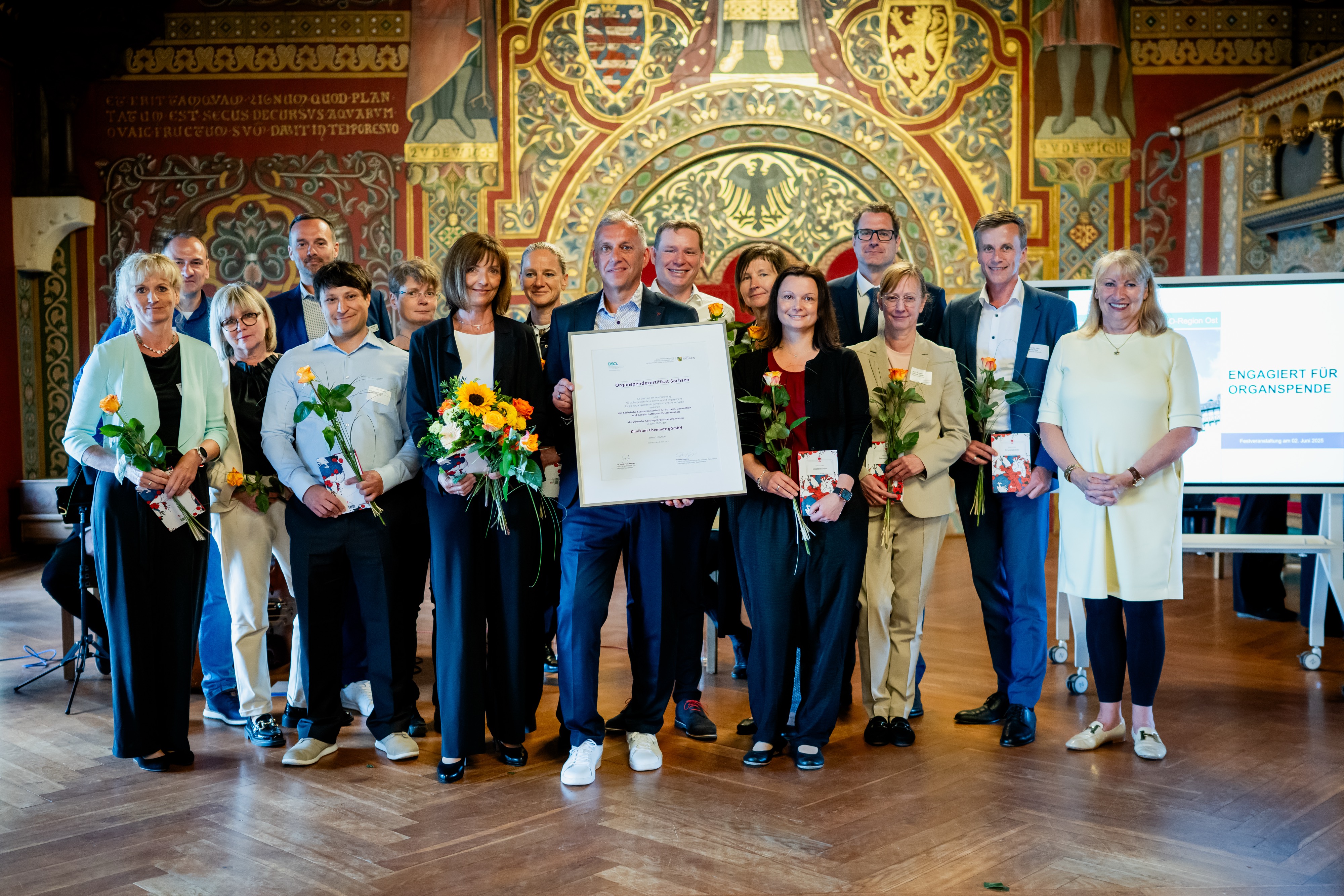 Das Klinikum Chemnitz wurde heute von der Deutschen Stiftung Organspende für sein Engagement in der Organspende geehrt. Stellvertretend für alle engagierten Mitarbeiterinnen und Mitarbeiter hat das Team der Stabsstelle Transplantationsbeauftragte um Dr. Gunnar Richter die Auszeichnung auf der Wartburg in Eisenach aus den Händen der sächsischen Gesundheitsministerin Petra Köpping entgegengenommen. Jedes Jahr ehrt die DSO Region Ost gemeinsam mit den zuständigen Ministerien der Bundesländer je ein Krankenhaus aus Sachsen, Sachsen-Anhalt und Thüringen.