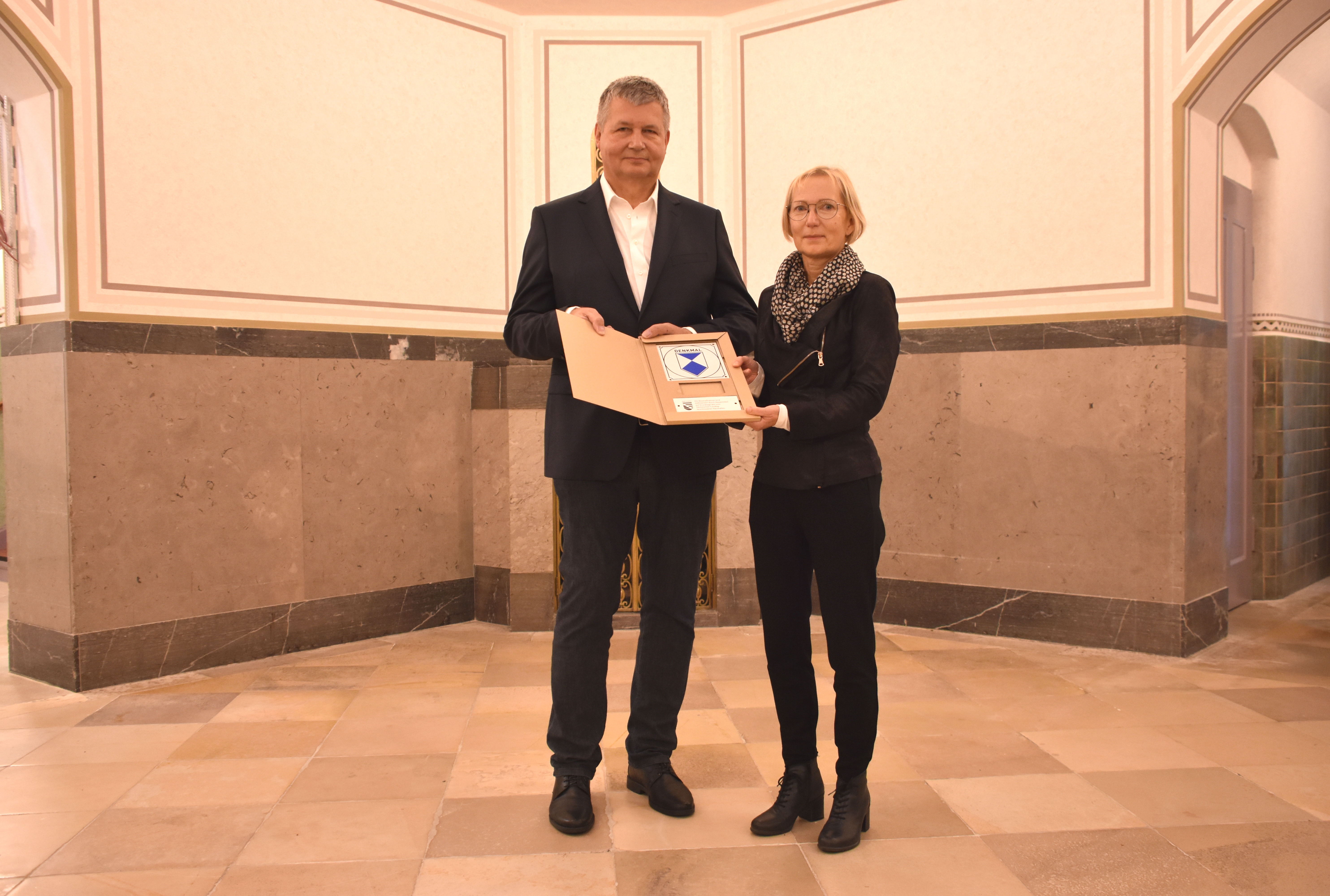 Hinweis für Medienvertreter und Redaktionen: Das dieser Pressemitteilung beigefügte Foto zeigt Bettina Schülke, Leiterin der Denkmalschutzbehörde der Stadt Chemnitz, und den Medizinischen Geschäftsführer des Klinikums Chemnitz, Prof. Dr. Ralf Steinmeier, bei der Übergabe der Denkmalschutzplakette für den Klinikum-Standort Küchwald. Das Foto kann mit dem Hinweis Foto: Klinikum Chemnitz im Zusammenhang mit dieser Pressemitteilung honorarfrei verwendet werden.