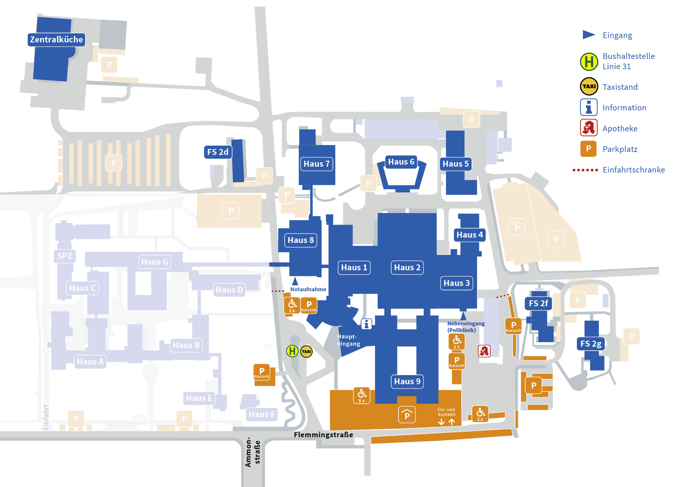 Besucherparkplätze an der Flemmingstraße 2 (P1 (Kurzzeitparkplatz mit zwei Behindertenstellplätzen), Parkdeck, P3 (kostenpflichtig))